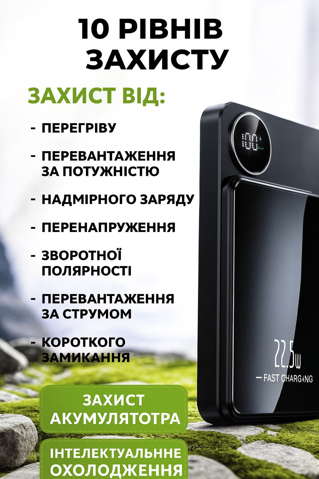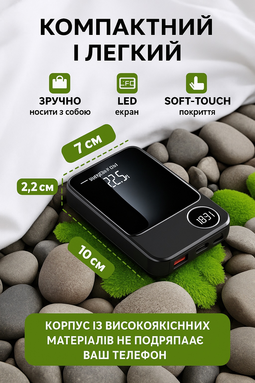 - Особливості: Дисплей, Індикатор рівня заряду, Бездротова зарядка, Під нанесення логотипу, Швидка зарядка, Індикатор рівня заряду